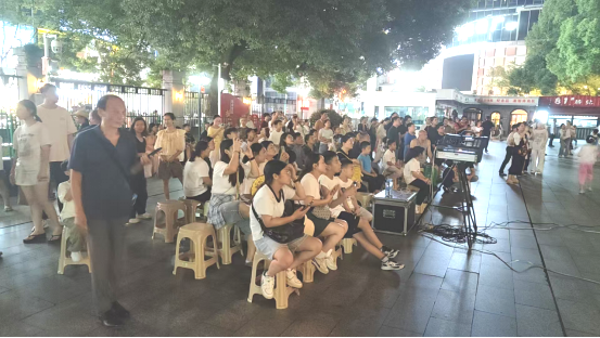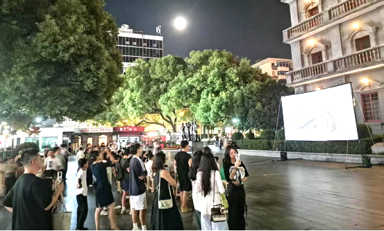 每当放映日傍晚,南昌八一起义纪念馆广场前便热闹起来。自发组织的观众,结伴而来的旅客都驻足等候,大家有序落座,目光始终朝着即将亮起的银幕。影片放映时,广场瞬间安静下来,只有银幕上的台词与背景音乐回荡在空气中,观众们紧跟剧情节奏,时而眼眶泛红,时而心生敬意;放映间隙,不少人主动分享感悟,或是拿着工作人员发放的小红旗,交流革命历史细节。