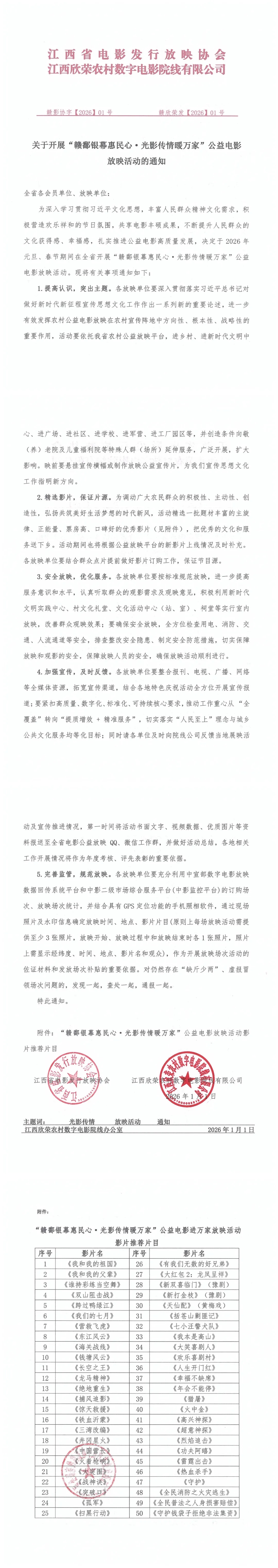 关于开展“赣鄱银幕惠民心·光影传情暖万家”公益电影放映活动的通知-赣影协字【2026】01号、赣欣荣发【2026】01号